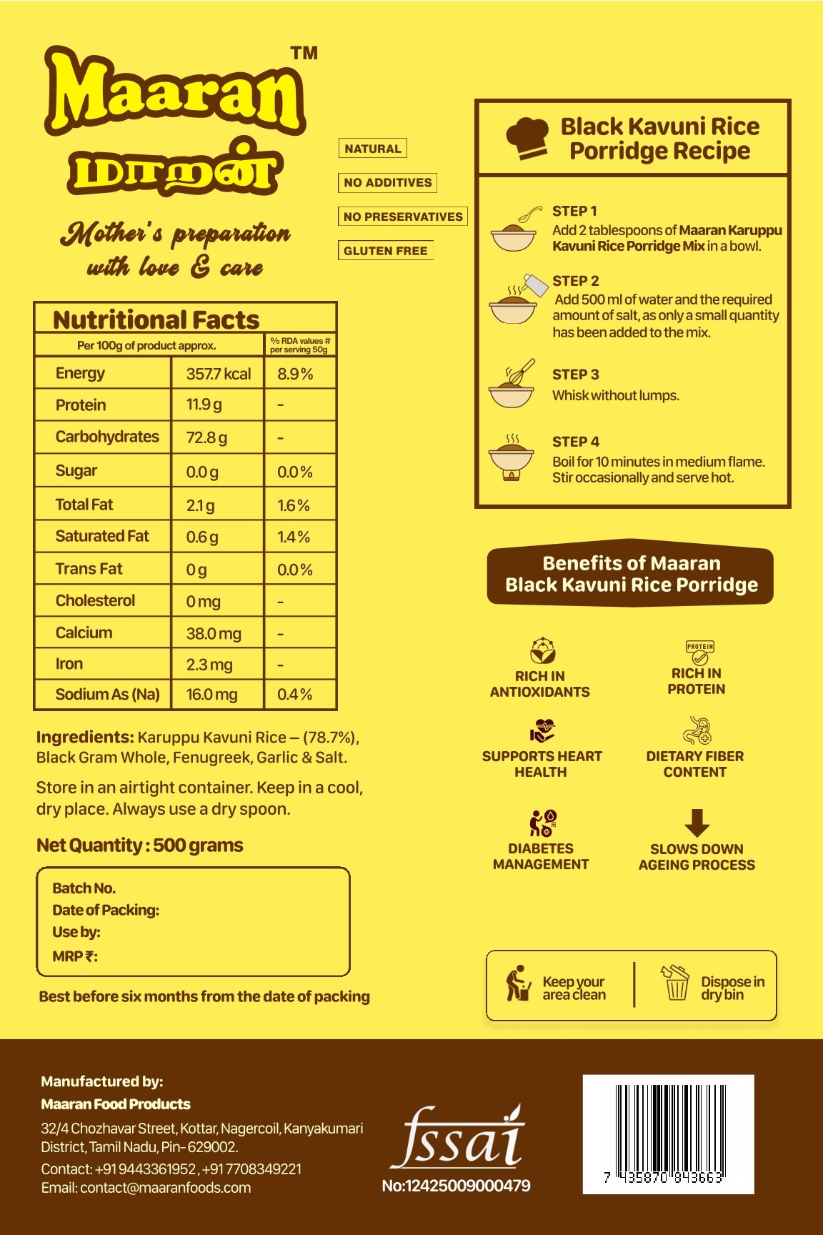 | Maaran Foods blends Tamil tradition with natural nutrition. All products are made from locally sourced grains, free from preservatives, and suitable for all ages. |