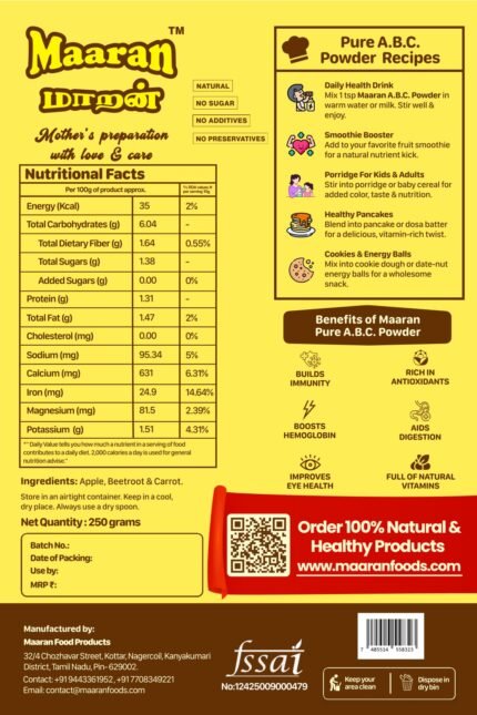 A.B.C பவுடர் The natural ABCs of immunity and vitality. A unique blend of Amla, Beetroot, and Carrot, this powder is packed with antioxidants, vitamin C, iron, and beta-carotene. It supports immunity, improves blood health, and boosts skin glow—all in a convenient, natural form suitable for all ages.Sprouted Ragi Idli Mix (500 gm)