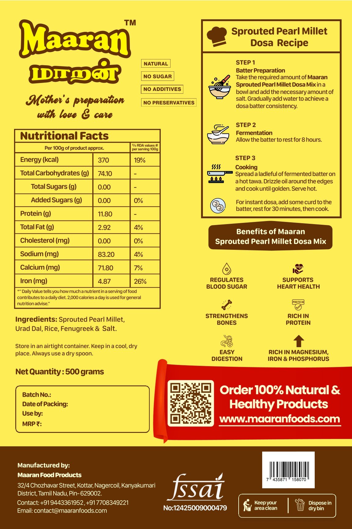 | Maaran Foods blends Tamil tradition with natural nutrition. All products are made from locally sourced grains, free from preservatives, and suitable for all ages. |