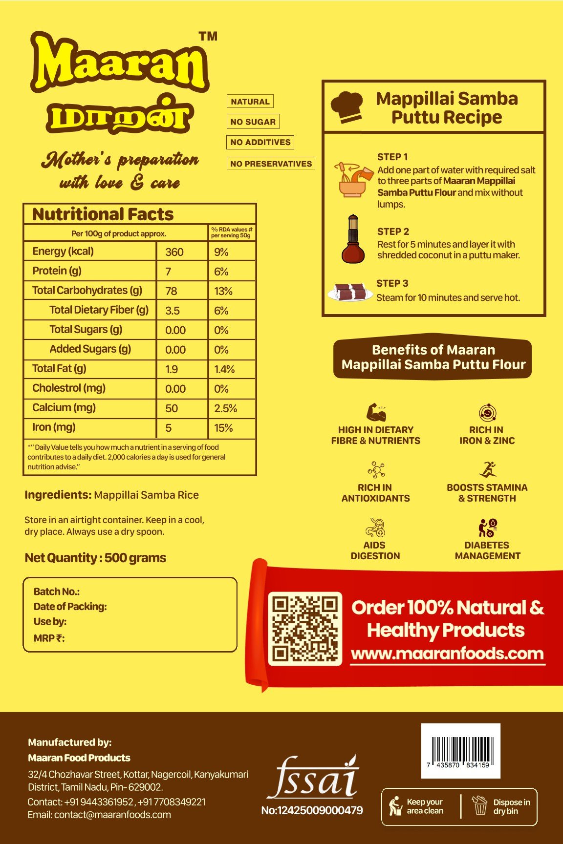 | Maaran Foods blends Tamil tradition with natural nutrition. All products are made from locally sourced grains, free from preservatives, and suitable for all ages. |