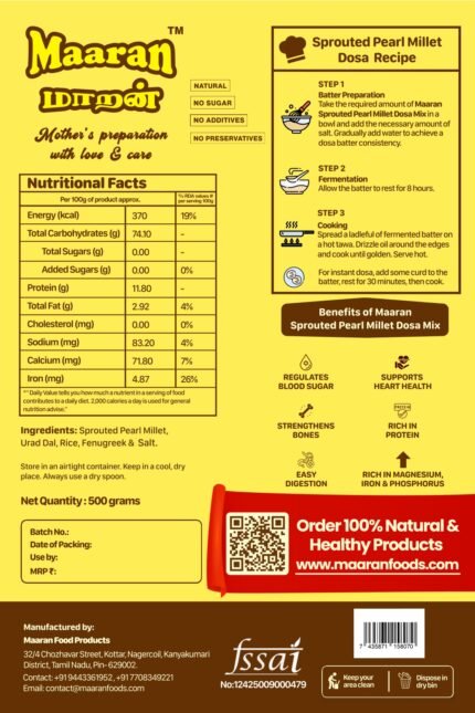 மாறன் முளைகட்டிய சத்து மாவு Power-packed blend for all-round nourishment. This traditional sprouted health mix is a carefully curated blend of native grains and pulses, sprouted to enhance digestion and nutrient absorption. Rich in protein, fiber, and essential minerals, it supports immunity, energy, and gut health naturally—making it a wholesome daily companion for the entire family.Sprouted Pearl Millet Dosa Mix (500 gm)