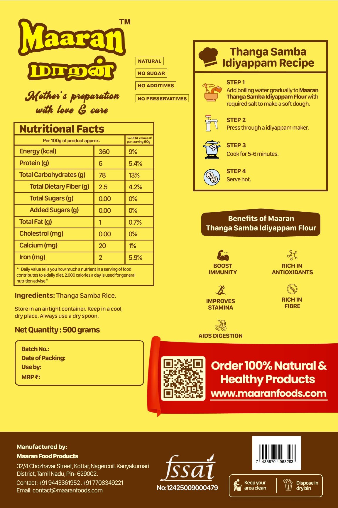 | Maaran Foods blends Tamil tradition with natural nutrition. All products are made from locally sourced grains, free from preservatives, and suitable for all ages. |